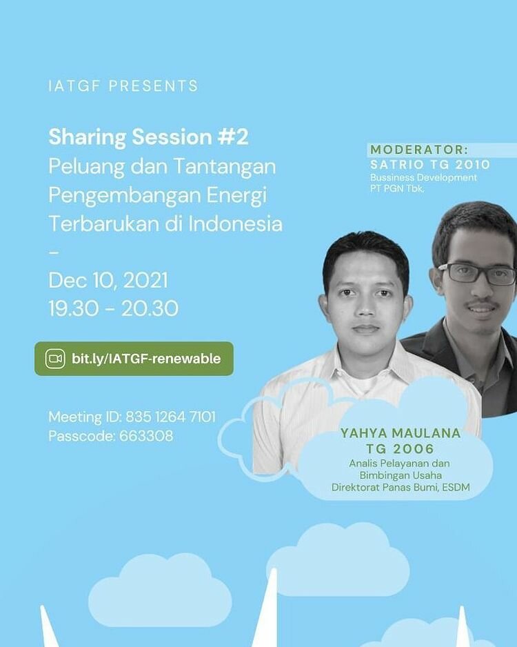 Seperti pada "Sharing Session" sebelumnya, kali ini topik yang diangkat tentang energi terbarukan yang cukup menjadi perhatian negara sebagai alternatif pemenuhan kebetuhan energi. Pada acara ini dibahas tentang tantangan dan peluang serta teknologi dan potensi pengembangan energi terbarukan yang ada di Indonesia bersama Kang Yahya (TG '06) dan dipando oleh Kang Satrio (TG '10)